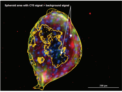 通过Agilent BioTek Gen5软件的双Mask分析工具来定量软骨细胞的分化,主Mask用于识别圈选整个3D球体,次级Mask用于屏蔽球体内的区域,使得胶原蛋白II抗体标记的CY5信号高于背景阈值水平(图7)。