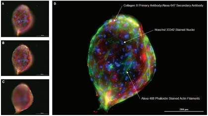 图6. 三维球面图像的z轴叠加与投影。(从A到C)各个z平面的图像;(D)软骨细胞分化的hMSCs球形最终z轴叠加图像。箭头表示细胞核、胶原蛋白和蛋白质表达。