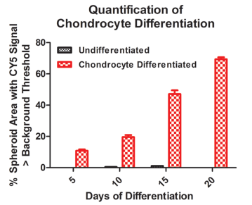CY5的细胞面积覆盖率即为细胞分化程度和II型胶原蛋白的表达,可通过次级Mask与主Mask的比值来计算,以百分比表示(图8)。与未分化的hMSCs球体细胞相比,软骨细胞分化后的hMSCs球体细胞中II型胶原的生成显著增加,从而验证了3D培养的hMSCs球体细胞可以成功分化为软骨细胞。