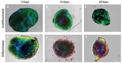 4.在第5、10、20天从BioSpa 8中分别取出一个含有2D细胞和3D球体的微孔板,通过Cytation 5进行荧光免疫染色以检测胶原蛋白的表达,验证软骨细胞的分化。