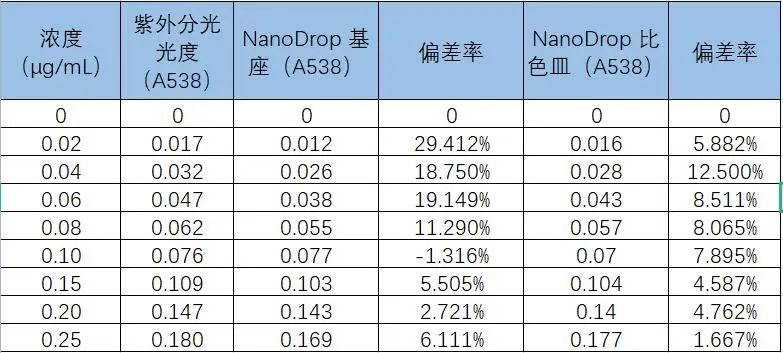 从以上结果中可以看出我用超微量基座以及比色皿检测的数据与标准品浓度均比较接近,比色皿检测的数据重复性相对更好,且随着亚硝酸盐浓度的提高,我的检测数值与紫外分光光度计的检测数值更加接近,偏差较小。但是我使用更低的上样量(100μL)即可开展实验,而大的紫外分光光度计一般需要1-2mL。