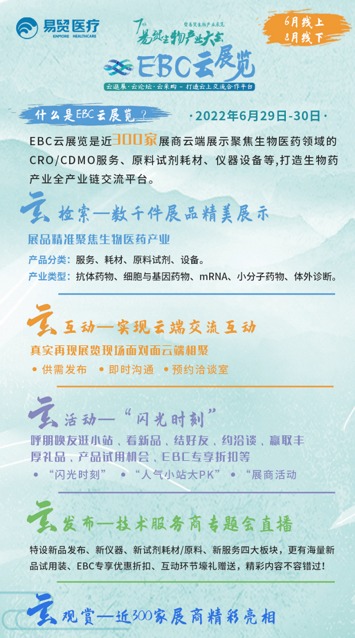 EBC云展览是2022易贸生物产业大会暨易贸生物产业展览的线上大型展览,打破时间和空间的制约,云端联动旨在通过云逛展、云论坛、云采购打造云上交流合作平台!