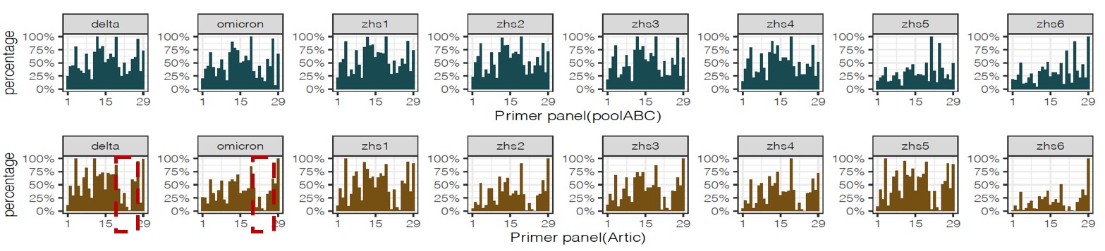 2. 红框标识出Artic引物(Version 3)在S区段有部分覆盖度很低或无法成功扩增;poolABC引物(美格生物)能很好的覆盖整个新冠病毒基因组,保证测试效率。