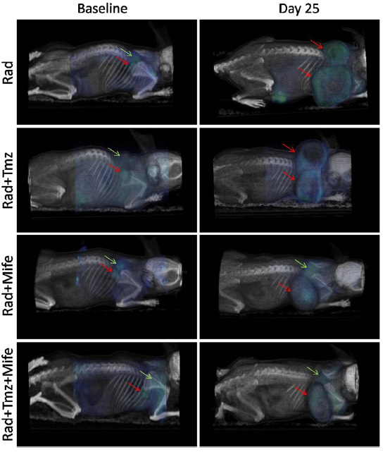 癌症联合治疗方法向来被寄予厚望,在于其能够处理多个分子靶点,并减少耐药性的风险。一项相关的研究使用了临床前PET/CT成像来监测不同治疗组合的18F-FDG肿瘤摄取情况,包括单独放疗(Rad)、Rad+替莫唑胺(Tmz)、Rad+米非司酮(Mife)以及Rad+Mife+Tmz。Rad+Tmz是胶质母细胞瘤的典型治疗方案,但研究发现,与其他治疗组合相比,使用Mife作为诱导剂更能抑制肿瘤生长1(图1)。虽然尚不能完全确定Mife的这种化疗辐射敏感效应的机制,但这类研究有助于研究人员朝着改善现有癌症疗法迈出重要的一步。