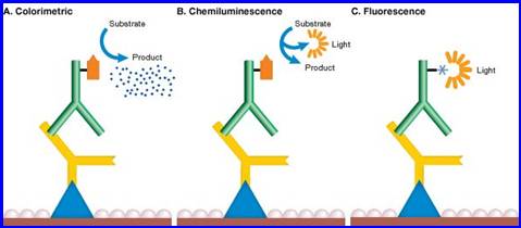 化学发光法:HRP在过氧化氢的存在下,氧化底物鲁米诺(lumino)并发光,通过发光增强剂可以使发光灵敏度提高千倍以上,用X射线胶片,CCD照相机成像装置或检测化学发光的成像仪捕获。