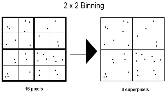 图示为2×2的像素合并,感光芯片的原始分辨率为16(4x4)像素。启用 2x2 的 Binning 模式,相当于将4个像素作为一个像素的模式读出,以这种模式拍摄可以将4个像素点所采集的信号叠加,相机灵敏度可以提升至原始输出的4倍,但是输出的图像分辨率却为原始分辨率的四分之一。同理,采用4x4的 Binning 模式,相机灵敏度可提升至原始输出的16倍,但图像分辨率降至原始分辨率的十六分之一,因此可以通过像素合并(Binning),增加像素尺寸,提高灵敏度。