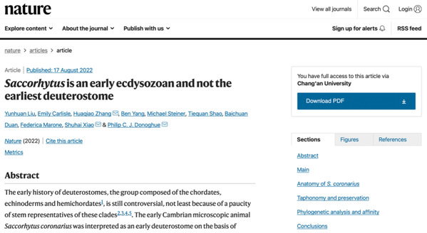 由长安大学刘云焕教授领衔的科研团队、中国科学院南京地质古生物研究所、美国弗吉尼亚理工大学、英国布里斯托尔大学、山东科技大学、德国柏林自由大学、地质科学院地质研究所、自然资源部第一海洋研究所和瑞士光源等5个国家、9家单位科学家组成的国际联合研究团队对陕南寒武系幸运阶(约5.35亿年前)的微体化石皱囊虫(Saccorhytus)进行了深入研究。该研究论文于2022年8月17日在国际顶级学术期刊《自然》杂志上在线发表长文,题为《皱囊虫(Saccorhytus)是一种早期的蜕皮动物,而不是最早的后口动物》(《Saccorhytus is an early ecdysozoan and not the earliest deuterostome》)。中科院南京古生物研究所张华侨研究员为第一通讯作者、长安大学刘云焕教授为论文第一作者,长安大学为第一作者单位。这是长安大学建校以来第一篇在国际顶级期刊《自然》(Nature)上首次发表的长文(article),实现了零的突破。