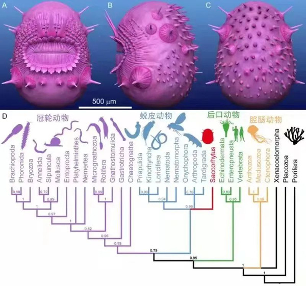 皱囊虫的复原图和系统位置图。A,前视;B,左侧视;C,后视;D,皱囊虫为蜕皮动物