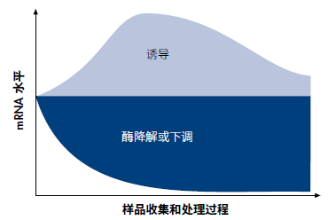 无论是动植物样本还是其他样本,在处理和收集样本时,细胞中的RNA表达普通常会发生改变,即基因会在组织离体状态下会发生表达的上调或下调(图2)。另外,细胞内的RNA酶对RNA的降解也会在此期间发生,而同时启动的细胞凋亡程序也可能导致RNA转录水平的变化(图2)。