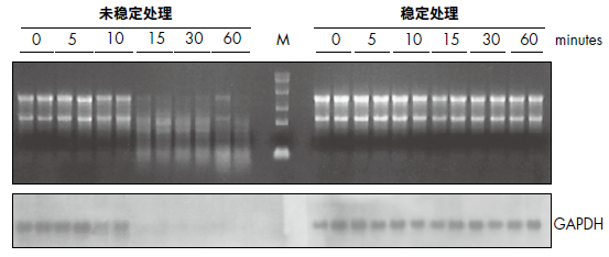 图3. 从经过稳定的样本中纯化得到未降解的RNA。获取大鼠肾脏后立即在RNAprotect Tissue Reagent中稳定或不进行稳定,0-60分钟后分阶段从稳定处理组和未稳定处理组的样本中纯化RNA并进行琼脂糖凝胶电泳和Northern blot分析。