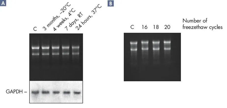 图4. 组织中RNA稳定:不同的储存温度和反复冻融。