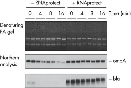 在下图的实验中,为了监测mRNA的降解,向生长的大肠杆菌培养物中添加RNA聚合酶抑制剂利福平来终止转录。随后将培养物等分成两半,并将RNAprotect Bacteria Reagent加入其中的一半培养物中。在进行离心和RNA纯化之前,样品在室温下分别放置0、4、8和16分钟。通过琼脂糖凝胶电泳分析所得RNA(图5中上图)。通过Northern blot检测具有不同半衰期的两个标记基因的表达,分别得到中图ompA基因(半衰期为15分钟)和下图bla基因(半衰期为2-5分钟)的Northern blot结果。该实验结果表明,向细菌培养物中加入RNAprotect Bacteria Reagent能够有效的防止RNA降解,保持RNA的完整性且稳定时间可以持续长达16min。