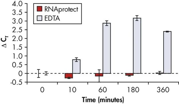 研发人员分别使用RNAprotect Animal Blood Tubes和EDTA采血管收集来自同一只大鼠的血样 (500μl),并将收集的样品在15–25℃下储存0分钟 (t=0) 至6小时,并随后使用RNeasy试剂盒纯化RNA后通过定量PCR来分析FOS表达量。Y轴上的ΔCT表示t=0样本时的CT值减去当下时间的CT值。该实验表明,在使用RNAprotect Animal Blood Tubes稳定的样品中,FOS基因表达保持稳定,但在EDTA管保存的样品中FOS的表达情况会随着时间延长而发生变化(在其他大鼠中观察到相同的结果;数据未显示)。
