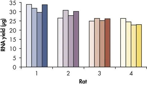同样,在采用分光光度计法对从4只大鼠通过使用RNAprotect Animial Blood Tubes收集的血液样本中的RNA质量进行测定后可看到,不仅RNA产量稳定,且来自同一大鼠的不同血样RNA得率 (%CV) 的差异性仅在2.4%-5.9%之间。