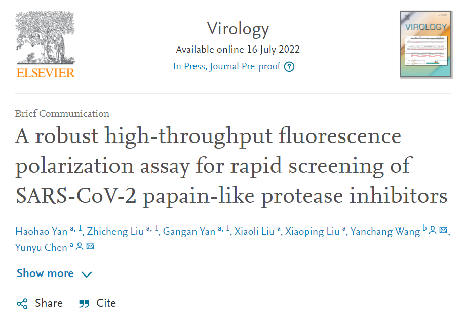 近期皖南医学院陈云雨教授带领的团队,开发了一种强大而简单的三明治状荧光偏振 (FP) 筛选方法,用于 PLpro 抑制剂的发现。