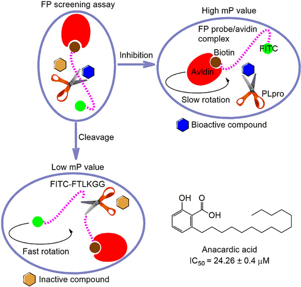 在本研究中,作者首先应用 FP 技术开发了一种优化的三明治状 FP 筛选方法,用于 PLpro 抑制剂的发现。该方法在高通量筛选( HTS) 应用中显示了稳定性高、便捷和低成本的优势。