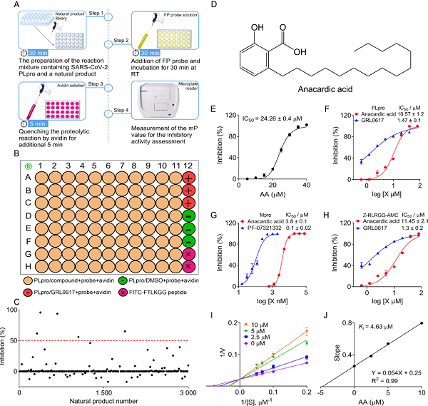 为了快速可靠地筛选天然产物,每个筛选微孔板的排列应如图 B 所示,阳性 (GRL0617) 、阴性 (DMSO) 和背景对照应包含在每个筛选周期中。经过筛选和验证,确认盐酸为 PLpro 的有效抑制剂。然而,anacardiacid具有细胞毒性,需要进一步的化学修饰和结构优化来提高其靶标特异性,降低其细胞毒性。