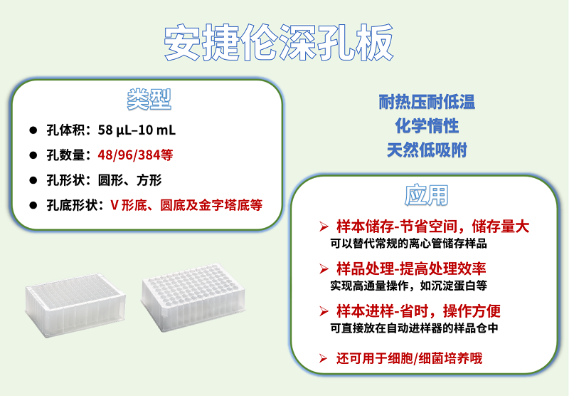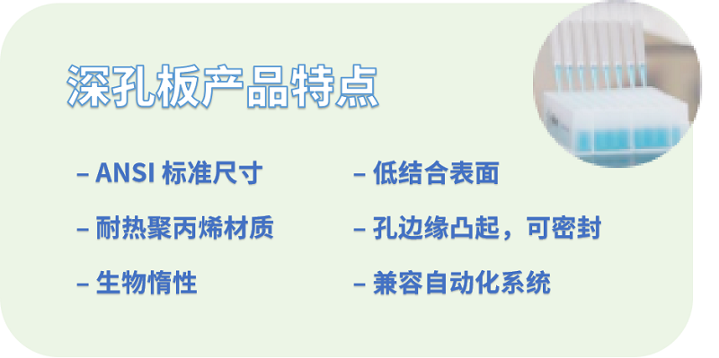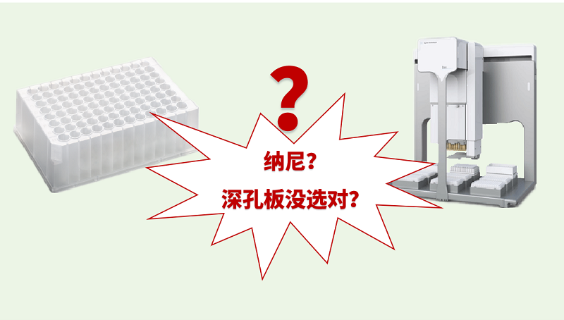 其实不同的样本,对于深孔板材质性能要求是不同的。如:粘稠溶液或蛋白样本很容易粘附在深孔板上,就要求板子的材质是低吸附,不然会出现吸取样品后板壁挂液很多,或者储存一段时间后,样品吸附在板子上,最终导致检测到的样本量很少甚至检测不到。还有一些强酸/DMSO等有腐蚀性液体,就要求板子材质耐腐蚀(如:聚丙烯),不然储存一段时间后,深孔板的材质可能慢慢溶解在样本中,导致检测结果异常。