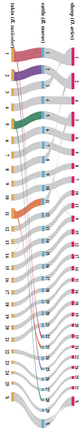 紧接着,研究人员利用基因组组装结果进行了染色体进化分析。以抹香鲸和长颈鹿作为外群,研究人员重建了牛、山羊、绵羊和羚牛的祖先核型。与牛科动物的祖先核型(2n = 60)相比,山羊的核型(2n = 60)只经历了一次易位,而绵羊的核型(2n = 54)则包括了3个融合和1个易位,羚牛的核型(2n=52)则包括了四次融合和一次易位。如图3所示,从牛到羊有 3 种染色体融合,包括 Chr 1 和 3 融合至 Chr 1,Chr 2 和 8 融合至 Chr 2,Chr 5 和 11 融合至 Chr 3。相比之下,从牛到羚牛有四个融合,包括 Chr 1 和22融合至 Chr 1,Chr 2 和 25融合至Chr 2,Chr 5 和 28 融合至 Chr 5,以及 Chr 11 和 23 融合至 Chr 11。易位发生从牛 Chr 9 到羚牛 Chr 14 和绵羊 Chr 9。