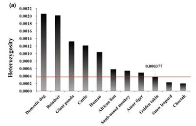 最后,为了探究秦岭羚牛的濒危原因,研究人员进行了遗传多样性的研究。研究人员基于基因组测序结果,发现了3,328,260个SNP,远多于之前的研究。秦岭羚牛的SNP θπ为0.00028,同时9个秦岭羚牛基因组的平均杂合度约为0.00038,如图4a所示,该值远低于大熊猫金丝猴等保护动物。平均基因组近交系数(FROH)为0.217,如图4b所示。秦岭羚牛的遗传多样性极低,近交程度高,表明其处于严重的近交衰退和濒危状态。该文为更好的保护秦岭羚牛提供了宝贵资料。