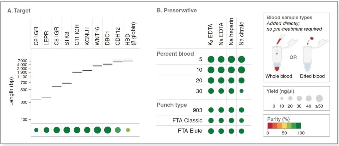 根据说明书推荐的标准反应条件,使用 Q5® 血源直扩 2X 预混液进行 35 个循环的 PCR 扩增。使用 LabChip® 微流控分析仪对产率和纯度进行定量,结果分别以圆点的大小和颜色展示:圆点面积越大、绿色越深,则表示扩增性能越强。