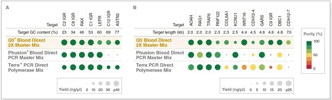 使用 Q5® 血源直扩 2X 预混液和其它几种市售血液直扩聚合酶,分别对不同 GC 含量 (23-77%)(A 图)和不同长度(2 -7 kb)(B 图)人类基因靶标进行 PCR。以 10% EDTA 保存的人全血为模板。根据说明书建议使用 50 µl 反应体系进行热循环。使用 LabChip® 微流控分析仪进行定量,结果分别以圆点的大小和颜色表示产量和纯度。结果显示:Q5® 血源直扩 2X 预混液对于各种类型的靶标均表现优异。
