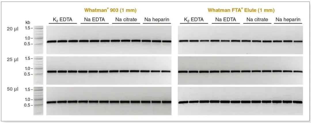 根据说明书推荐的标准反应条件,使用 Q5® 血源直扩 2X 预混液对干血中的人类基因组靶标(604 bp)进行 PCR。将不同抗凝剂抗凝的血样采集于 Whatman 903 或 FTA Elute 卡纸上,在上述干血卡纸打孔,分别直接加入到 20、25 或 50 µl 反应体系中。结果显示:在各种体积的反应体系、抗凝剂或滤纸类型中,均能达到稳健扩增。