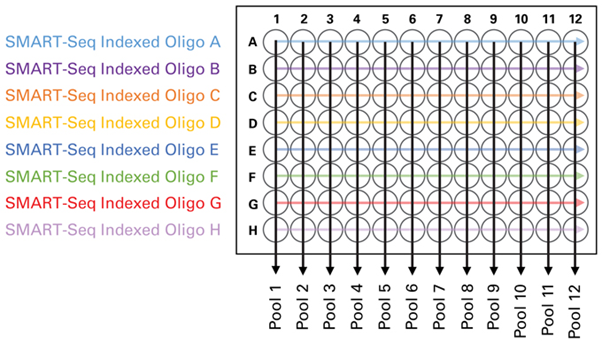 单细胞测序中涉及的文库数量更多,将每个单细胞文库做好标记对下游数据分析工作而言至关重要。通过SMART-Seq Indexed Oligo,可以在转录本cDNA第一链合成时,为同一细胞来源的转录本添加相同“身份标签”—— cell barcode。这样,孔板中同一列的8个细胞样品都有了自己的“身份标签”,将它们制备成12组混合文库进行V(D)J区序列的扩增,并添加上只属于自己组内的index标签序列。