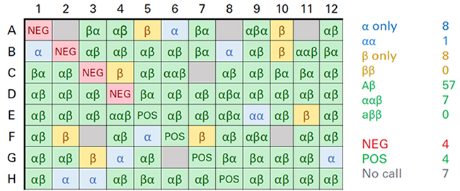 至少一条TCR链得到鉴定的比例是92%(81/88孔),α/β克隆型的鉴定比例是65%(57/88孔),同时鉴定到α和β链的克隆型比例是73%(64/88孔)。
