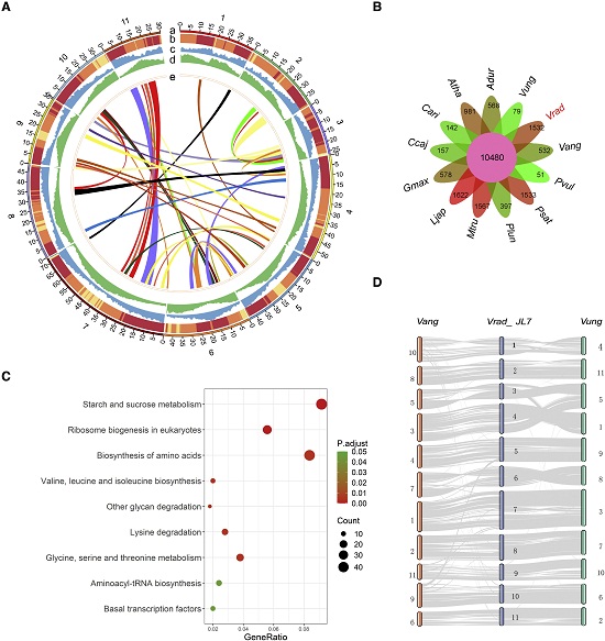 图1:绿豆基因组组装和豆科成员的比较基因组分析。(A)绿豆基因组,圆圈从最外层到最内层分别表示:a.假染色体 b.GC含量 c.基因分布 d. DNA转座子和反转录转座子密度 e.基因组内共线区块;(B)通过OrthoFinder鉴定的12种豆科和拟南芥中的同源基因家族;(C)绿豆中特定基因家族的 KEGG 途径富集;(D)绿豆(Vrad_JL7)、小豆(Vang)和豇豆(Vung)之间的基因组共线性。