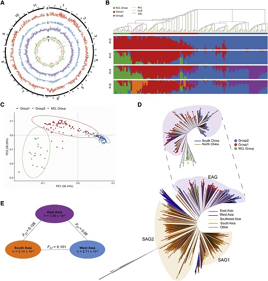 图2:绿豆种群基因组分析。(A)217种材料的变异图谱。圆圈从最外层到最内层代表:a.假染色体 b-d.SNP、插入缺失和SV密度 e和f.非同义和同义SNP;(B) 从核心SNP推断的207个种质的无根树和ADMIXTURE (K = 2-5)图;(C)207个加入的前2个特征向量的PCA图;(D) 207和750个种质的无根树;(E)亚洲不同亚群的F-统计(FST)和核苷酸多样性(p)。