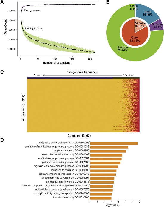 图3:中国绿豆种质资源泛基因组。(A)基于每个给定数量的材料的100个随机组合,模拟泛基因组大小的增加和核心基因组大小的减少。使用所有随机子样本的数据点拟合泛基因组和核心基因组曲线,并用实心黑线表示。紫色和绿色区域的上边缘和下边缘分别对应于最大和最小基因数;(B)绿豆泛基因组的组成;(C)基因PAVs的分布;(D)可变基因的GO富集。