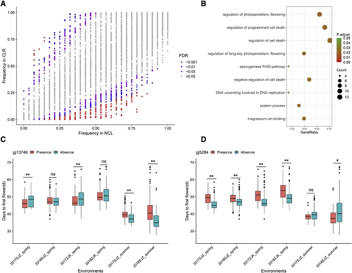 该研究也详细比较了NCLs、CLRs和CBLs中的基因计数和频率。为了确定适应过程中被选择的基因PAV,绘制了NCLs中每个基因的频率与CLRs中每个基因的频率的对比图。两组之间809个基因的频率存在显著差异,其中215个基因被认为是有利的,412个基因被认为是不利的。在适应过程中,与开花调节和程序性细胞死亡相关的基因在有利和不利基因中显著富集。已鉴定出9个与开花调控相关基因的PAV事件,其中3个(jg13350、jg13746和Pang80812)存在于大多数CLRs和CBLs中。表型数据表明,这些基因的存在可以促进春季早花,但与夏季晚花有关。其他六个基因(jg1521、jg5273、jg5274、jg5281、jg5284和Pang68295)在大多数CLRs和CBLs中缺失,并存在于大多数NCLs中。它们与开花表型的关系与前一种情况完全相反,这些基因的缺失,而不是存在,与春季开花早而夏季开花晚有关。