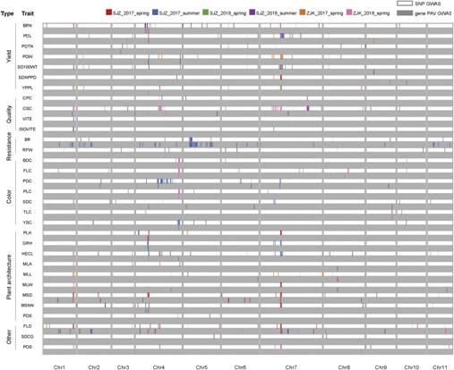 图5: SNP GWAS和基因PAV GWAS结果总结。由Vrad_JL7 基因组内的 SNP GWAS(白框)和基因 PAV GWAS(灰框)识别的所有STAs和GPTA事件的分布,用于6种不同环境下的6种类型的32种性状。