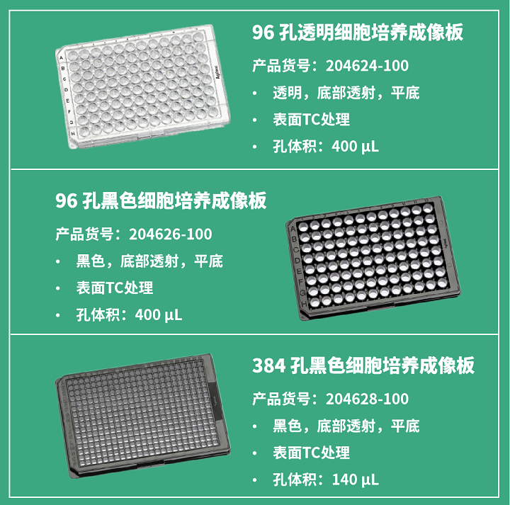 安捷伦提供高分辨率,高清晰度的细胞培养成像板-采用透光性高的聚苯乙烯材质,板底透明且超薄,平整度高,96孔/394孔的板子更是便于添加各种条件进行高通量筛选,可广泛应用于In-Cell Western/高内涵成像/活细胞成像/基于细胞的荧光实验等!