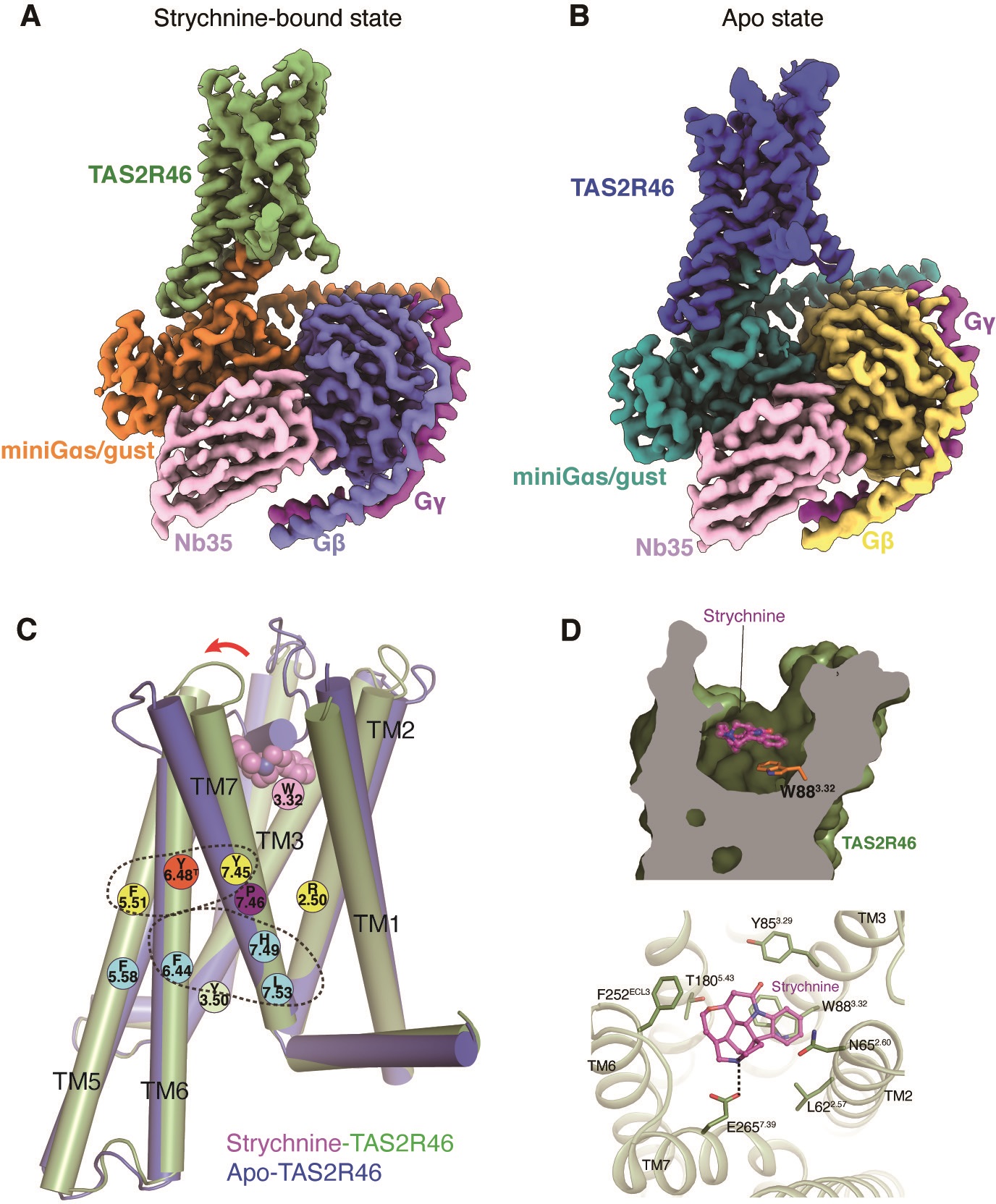图|(A-B) 分别与马钱子碱(strychnine)结合 (A)和Apo状态 (B)的苦味受体TAS2R46与味转导素嵌合体的复合物电镜结构;(C)不同状态下TAS2R46的结构比较以及参与受体激活的关键结构域;(D)马钱子碱在TAS2R46里的结合口袋和与其相互作用的关键氨基酸。
