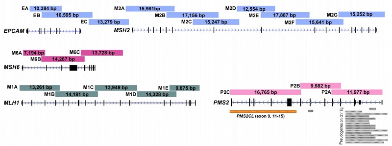 扩增子具体长度及覆盖范围如下图所示(图1)。值得注意的是,对于PMS2,在基因区域下方可见chr7上的高度同源区域(橙色部分>99%相似度,灰色区域90%-98%相似度)。