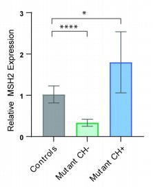 测序结果显示,LLP004个体中携带有两种深内含子MSH2变异:c.793-603C>T 和 c.2458+976A>G。共分离分析表明,c.793-603C>T 不与家族内的癌症表型共分离,因此该突变不是MSH2的PV;c.2458+976A>G在其他3个患病亲属中产生了共分离。进一步对一个患病表亲的淋巴母细胞系中提取的MSH2 mRNA进行定量分析,结果显示,与对照样本相比,实验组中出现了无意义介导的衰变(nonsense-mediated decay,NMD)和MSH2表达下降(图2)。