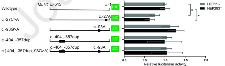 研究团队利用荧光素酶报告实验对LLP025 (MLH1 c.-404_-357dup)中MLH1启动子48bp串联重复序列的影响进行了评估。结果表明,与野生型MLH1启动子相比,MLH1 c.[-404_-357dup;-93G>A]单倍型的启动子活性水平相似(图4)。此外,未观察到种系MLH1启动子的高甲基化。因此,这种重复目前被认为是一种意义未知的变异。在LLP014和LLP029个体中发现的PMS2 C .2276- 400G>C深内含子变异的Mini-gene分析表明,与野生型相比,剪接没有改变。