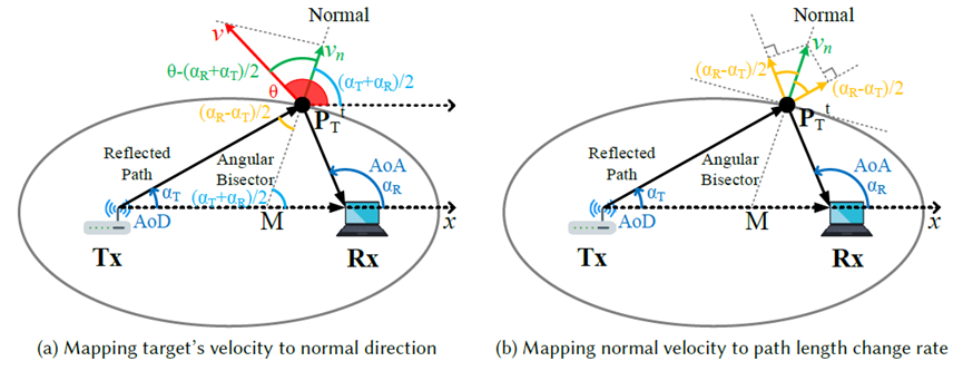作为无线感知最重要的信号特征之一,多普勒速度可从接收端接收到的WiFi信号中提取,从而支持轨迹追踪、手势识别等一系列应用。然而当利用WiFi信号估计目标的运动速度时,有两个重要理论问题尚无答案:(1)在WiFi感知范围内的任何位置,对目标的速度估计精度是否一直相同 ?(2)由于现实中WiFi设备摆放是任意的,如何才能够实现对目标准确的速度估计?论文“Rethinking Doppler Effect for Accurate Velocity Estimation With Commodity WiFi Devices”针对上述问题进行了探讨并给出了答案。张大庆团队从相对论性多普勒效应的基本概念出发,基于团队提出的菲涅尔区感知模型,建立了WiFi感知系统中多普勒频移与目标运动速度之间的关系,并定量分析了WiFi无接触感知中的速度(包括速度大小和方向)估计精度如何受到目标相对于WiFi收发设备的位置、目标运动方向等因素的影响,进而给出了实现准确速度估计的指导原则。最后,论文以手势识别和人体轨迹追踪为应用,给出了如何提取不受位置、运动方向等因素影响的速度特征的示例。该研究成果发表在CCF A类国际期刊IEEE JSAC 2022上,论文的第一作者为团队的牛凯博士。