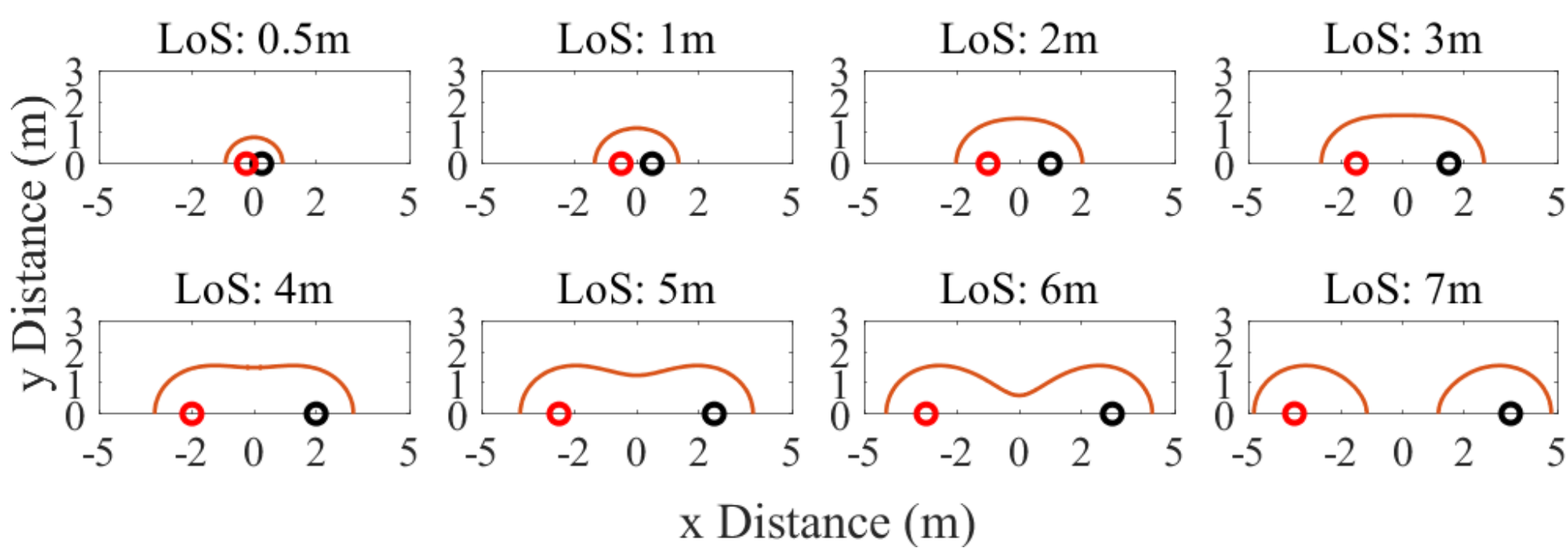图2. 在不同LoS长度下的感知覆盖范围边界,其中红色和黑色圈为Tx和Rx设备位置