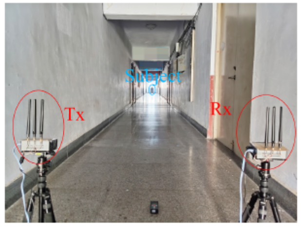 图4. 走廊40米呼吸感知实验场景和增强信噪比后的CSI信号以及提取的呼吸波形