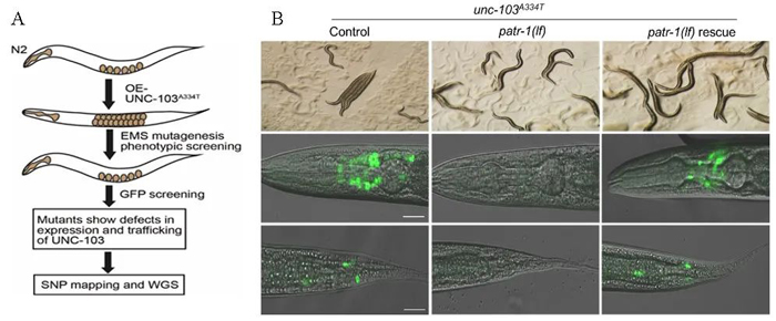 图1. A,筛选UNC-103通道生成调控基因的策略。B,线虫DNA拓扑异构酶2相关--蛋白PATR-1调控UNC-103通道生成。