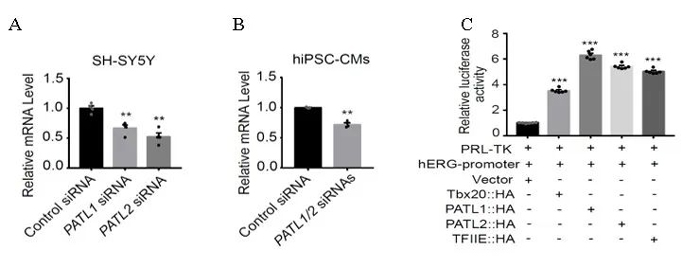 随后,研究人员探究了人源DNA拓扑异构酶2相关蛋白(PATL1和PATL2)是否调控hERG通道的功能。在人神经母细胞瘤细胞和人诱导多能干细胞衍生的心肌细胞(hiPSC-CMs)中,利用小干扰RNA下调PATL1和PATL2功能显著降低了内源hERG通道蛋白的表达水平和钾电流密度(图2A和B)。下调PATL1和PATL2表达还延长了hiPSC-CMs动作电位的时程,提示PATL1和PATL2可能影响心肌细胞的电生理特征(图2C)。通过双荧光素酶报告基因检测系统分析,发现PATL1和PATL2影响hERG mRNA的合成(图3)。