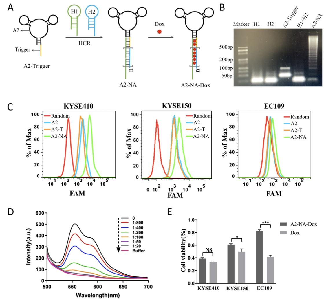 利用HCR(杂交链式反应)原理,设计出A2连接的DNA纳米结构,该纳米结构能够负载自身浓度100倍的Dox,并将其靶向递送至靶肿瘤细胞中,降低化疗药物的毒副作用。