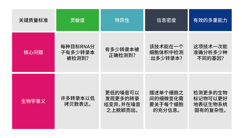 空间转录组学研究技术层出不穷,包括基于激光显微切割技术的Geo-Seq、探针捕获mRNA结合转录组测序、以及原位探针杂交加多轮超分辨荧光显微成像技术(比如MERFISH)等。后者可以实现单细胞分辨率的空间转录组研究,更好地分析细胞类型组成、细胞之间的空间临近、细胞通讯等。空间转录组学研究在加速,科学家们也在试图找到一种评估标准来帮助他们确保使用的工具和技术能够产生尽可能可靠、可用的数据。科学家们需要知道要注意哪些指标,以及可以期望的高质量数据是什么样的。我们描述了四个关键问题,您可以在比较空间转录组学技术时用来评估数据质量。