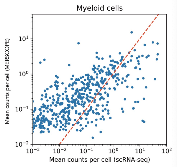 特异性可以通过将空间转录组学技术的数据与成熟的前身技术(如Bulk RNA测序或scRNA-seq)进行比较来表征。与scRNA-seq比较有助于将样本中每种细胞类型的细胞数量变化与检测到的基因表达谱进行比较分析。MERSCOPE能够与单细胞RNA测序保持很强的相关性,即使是表达最低的转录本。