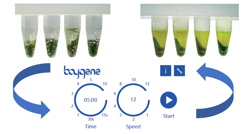 > 只需将珠子和缓冲液与样品一起放入标准管,管子放置在仪器内,选择时间和速度,并按下启动即可。