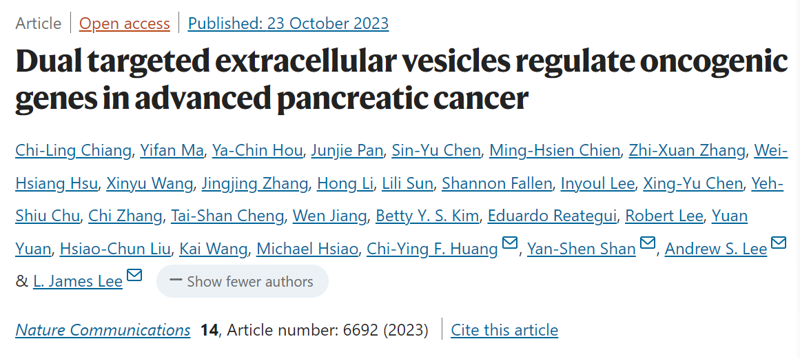 近日,由深圳湾实验室肿瘤研究所/北京大学深圳研究生院共同通讯作者Andrew Lee教授、医学博士与俄亥俄州立大学、思珀生物、台湾阳明交通大学、台湾成功大学医院和德克萨斯大学安德森癌症中心的联合合作在Nature Communications发表了《Dual targeted extracellular vesicles regulate oncogenic genes in advanced pancreatic cancer》一文。