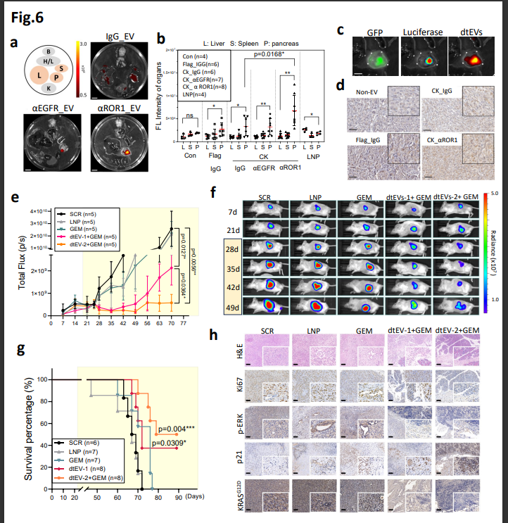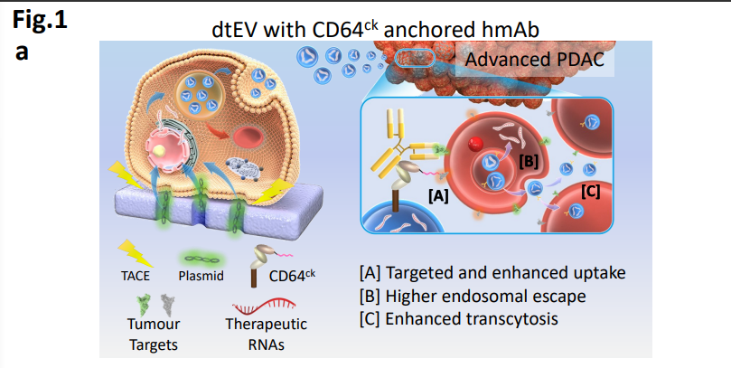 为验证双靶向系统肝外精确递送的准确性,该团队展示了mRNA与siRNA和化疗联合靶向递送到胰腺导管腺癌(PDAC)。研究中报道了一种易于扩展的双靶向治疗性EVs(dtEVs),该EVs含有高拷贝数的TP53 mRNA或siKRASG12D,可以有效抑制大型实体PDAC肿瘤。并通过蛋白工程设计,将dtEV表面的CD64 (fc-受体1)蛋白的N端与CKAAKNK(CK)组织归巢肽连接,同時CD64也可以连接人类单株抗体 (hmAb),实现了双重靶向胰腺肿瘤组织。